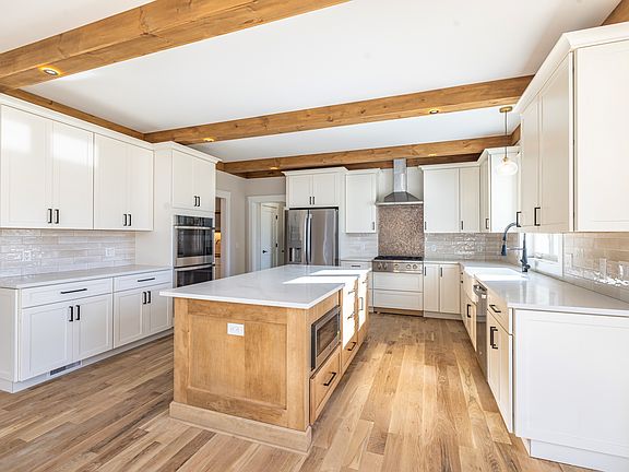 Stone fireplaceNatural wood beamsReclaimed wood mantelQuartz countertopsWhite oak hardwood flooringShiplap trim detailsCustom tile work
