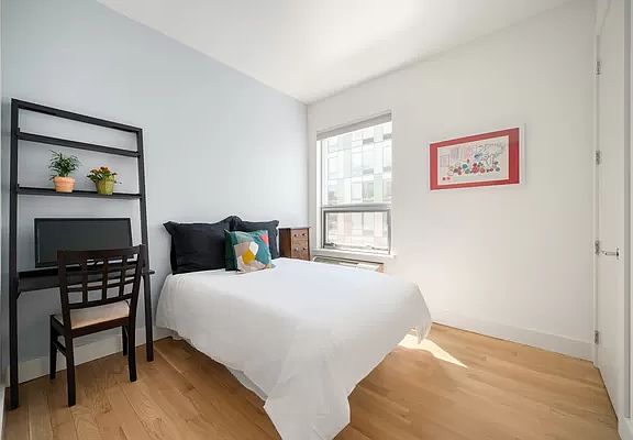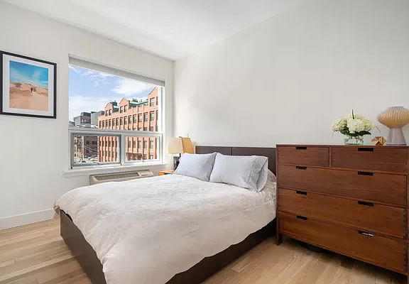 Newly finished floors, new appliances, new custom kitchen cabinetry, and freshly painted...ready for move-in! This modern 2-bedroom, 2-bathroom condo is ideally located adjacent to McCarren Park and a short walk to the waterfront in prime North Williamsburg. With private elevator entrance, enter directly into this home where 10' ceilings and a corner southern and western exposures fill the space with bright natural light. The open living/dining area is bright and airy with tall double glass doors which open to the Juliet balcony providing fresh air and a peek of the McCarren Park. There is ample room for a large dining table and comfortably furnished living room, with a custom-built window seat to maximize the space. The kitchen is equipped with striking blue custom cabinetry with brass fixtures, a glass backsplash, and white Ceasarstone counter tops. The appliance package consists of a new Frigidaire refrigerator, a new Frigidaire stove, and a matching Frigidaire dishwasher. A spacious primary bedroom can easily accommodate a king-sized bed with walk-in shower. The true treat is the southern picture window with a unique perspective down Roebling Street. The second bedroom has room for a queen-sized bed and also has a large closet. The spacious second bathroom has a deep soaking tub with upgraded fixtures. This home has newly refinished light oak hardwood floors throughout, custom window treatments, and smart lights by Philips Hue to adjust the lighting to any mood you desire. Tremendous storage throughout with 5 interior closets, including a linen closet with a Bosch washer/dryer, and delivered with an additional storage space just outside the front door. As an added bonus, smart Energy Star water heater and an upgraded HVAC system for optimal temperature control. 15 Roebling Street is a boutique, pet-friendly condominium with low monthly carrying costs and a tax abatement through 2026. The building offers a video intercom and a lovely private communal garden with a BBQ and outdoor dining area. Close proximity to the weekly farmers market, fantastic dining options, 36 acres of McCarren Park, the waterfront/ferry, and the Bedford Avenue L train and Lorimer G train.