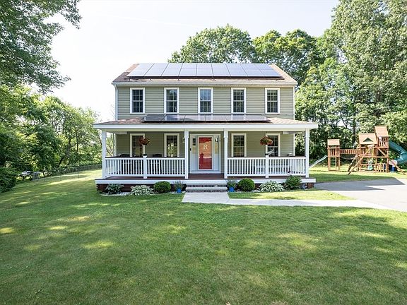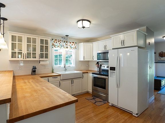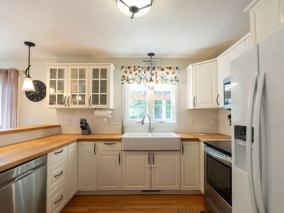 Prepare to be impressed by this beautifully appointed home, privately nestled at the end of a quiet cul-de-sac on more than an acre of land. Ideal for both indoor and outdoor entertaining, this property features an open-concept layout with a breakfast bar, crisp white cabinetry, butcher block countertops, a farmhouse sink, wainscoting, and gleaming hardwood floors throughout. The spacious primary suite includes a large walk-in closet and a luxurious Hollywood-style bathroom with dual vanities. Two additional bedrooms offer generous closet space and comfort. The finished lower level adds even more charm with a cozy family room, complete with a bar and sliding barn door-perfect for game day gatherings. Step outside to enjoy a private backyard oasis featuring a deck, pergola with bluestone patio, oversized shed, and a welcoming farmer’s porch—ideal for relaxing summer evenings. Don't miss your chance own this exceptional property complete with irrigation, generator hookup and Solar!