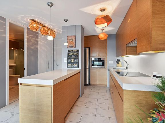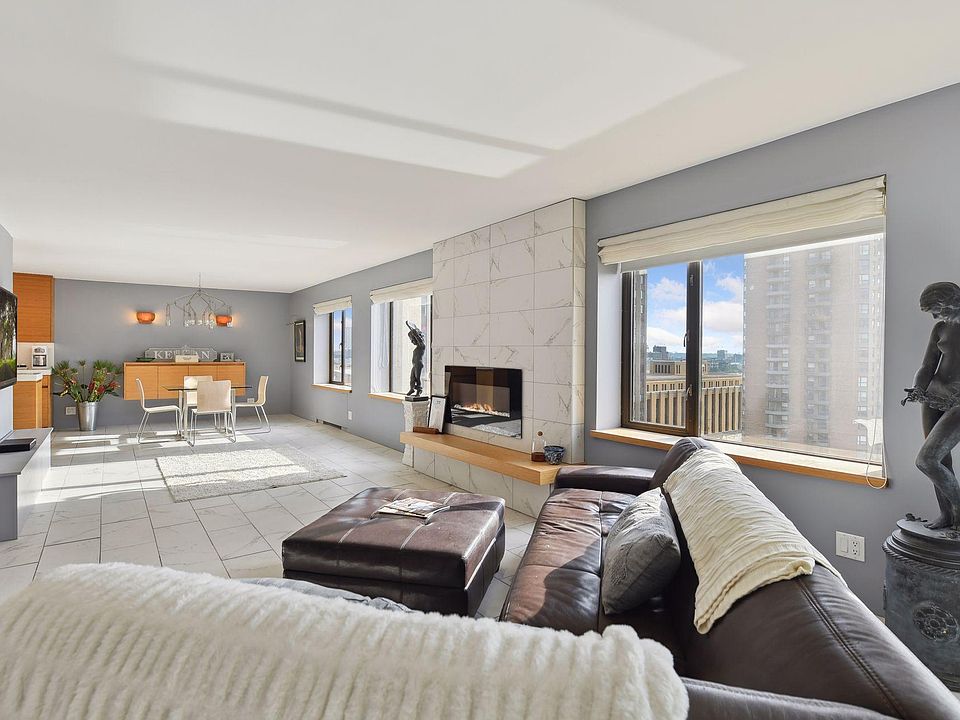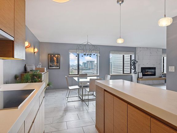 Welcome to this beautiful open concept condominium featuring a sleek Scandinavian-design aesthetic. Two units have been seamlessly combined to create a spacious living space designed by the renowned Partners 4 Design. Step inside and be greeted by a warm and inviting ambiance. The interior boasts etched glass doors, elegant floor-to-ceiling marble, and porcelain stone tile throughout. Take in the stunning urban skyline while cozying up to the fireplace. The kitchen is a chef's dream showcasing bamboo cabinets, an island, an 8 ft. buffet, stone and Corian countertops and backsplash. High-end appliances complete the modern kitchen. Custom under cabinet lighting and roll-out kitchen cabinet shelves offer convenience and functionality. Both bathrooms feature stunning glassed-in shower/bathtub combinations and custom cabinets. The master bedroom suite boasts ample space and custom closets. Don't miss the opportunity to make this stunning condominium your own!