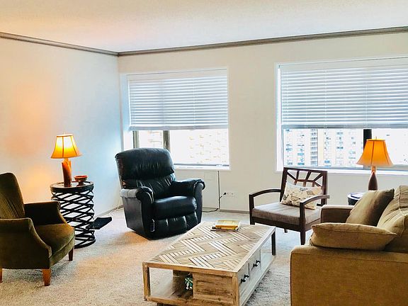 17th Floor Condo with 2 Bedroom and Den with Electric Fireplace (no Closet). This SE facing Condo has incredible views of Downtown Minneapolis and US Bank Stadium! Large windows grace all the rooms! Updated Kitchen and Bathes. Complex has outdoor pool, tennis courts and Party Room. Parking is extra at $90 indoor spot and $55 outside. Spots available. No pets are allowed in this building. Tenant pays for Electricity Included: Water/Sewer/Trash