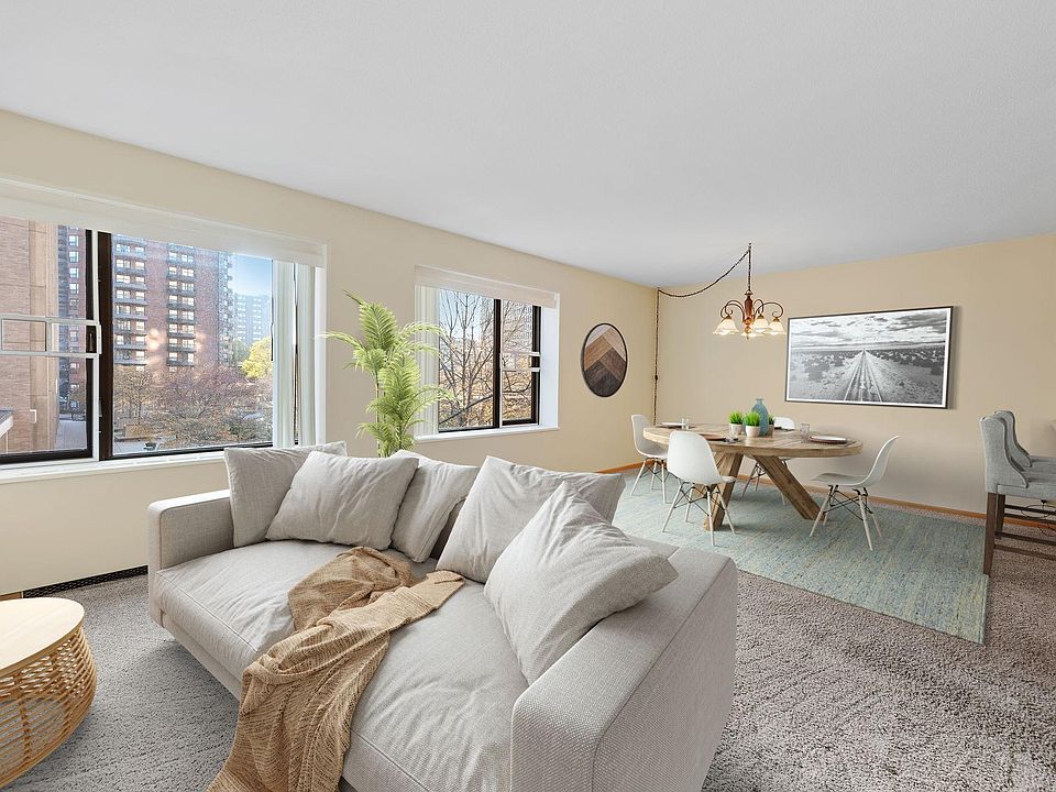 Move right into this cute & sunny 1 bedroom condo at River Towers overlooking courtyard! Fresh carpet and paint. Amazing amenities including 80' heated outdoor pool, dining & patio area with grills, 2 tennis courts (or pickle ball!), multiple fitness centers with weights & cardio, sauna, rooftop patio with 360 degree skyline & river views, guest suite, party/garden room, free laundry, library/business center, and 24 hour security. Guest parking, bike storage & EV charging available. Just blocks or less to riverfront trails, Whole Foods, skyway entrance, and some of Minneapolis' best dining/shopping/entertainment! Indoor & outdoor parking rentals available.