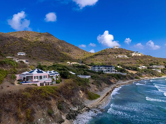 Pink on the Brink is a exciting waterfront, East End home featuring four identical en suite bedrooms, each with large baths, air-conditioning, and private patios for comfort and privacy. A spacious great room anchors the home, seamlessly blending indoor and outdoor living while capturing expansive sea views and the soothing sound of waves. The fully equipped kitchen and wet bar are ideal for entertaining, complemented by an two outdoor dining areas. An infinity-edge pool overlooks the gorgeous Caribbean Sea, and a private outdoor shower adds a fun island touch. Just a short walk to pristine beaches including the 300 acres of Nature Conservatory land. Historic Christiansted town is only 20 minutes away for shopping and dining. Solar powered and gated with colorful, tropical landscaping.