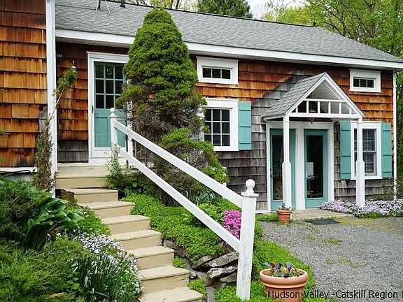 Delightful and spacious country ranch offers an impeccably designed interior and a cottage like exterior. Privately sited on 3 acres with a spring fed pond, mature trees and perennial gardens. Enjoy one level living with a second floor loft bedroom and a finished basement. This charming home features large rooms with wide board pine floors, custom finishes, skylights, French doors and a rocking chair porch. The Master bedroom suite off the solarium is privately located for quiet enjoyment. Entertainment flows easily from the kitchen/dining room/library to the screened porch and out to the landscaped pool. Work at home in the first floor office or use the loft as an art studio. Oversized, detached 2 car garage with workbench. Convenient to Red Hook and Rhinebeck Villages.