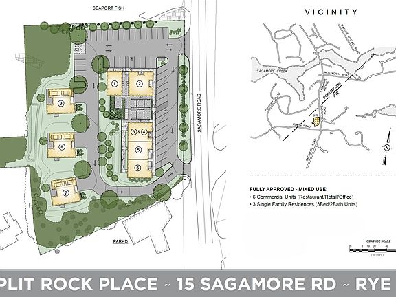 Investors & builders take notice of this extremely rare opportunity to develop "Split Rock Place" at Foyes Corner in Rye! This 2.02 acre mixed use property has full municipal approvals for 9 units: 3 free standing residential units tucked back behind 2 commercial buildings which are comprised of 6 commercial condo units. The beautifully designed Split Rock Place will be a further enhancement to this growing hub in Rye, centrally located in between downtown Portsmouth, the Rt 1 commercial district and Rye's oceanfront communities. An oversized pergola covered 2-level patio adds to the appealing facade of the project. This property features excellent visibility on Sagamore Rd. with approx. 259' of frontage, a generous amount of parking, and will be serviced by Portsmouth public water & sewer. Located among other popular businesses including The Atlantic Grill, Park'd and Summer Home Furnishings, and in close proximity to downtown Portsmouth and other shopping destinations on Rte. 1, this is one of Rye's premier locations. Don't miss the opportunity to own an important piece of this highly sought after Seacoast location!