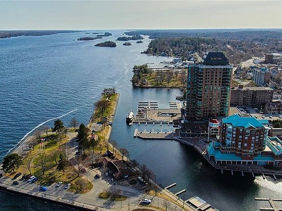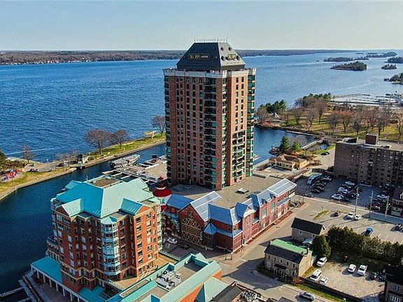 Come discover the charms of the 1000 Islands and the St Lawrence River from the 10th floor of this 'Cottageinium' (Trademark)! Huge amounts of glazing in this southwest corner suite draw maximum views, and maximum amounts of sunlight and moonlight into your suite. You'll never tire of the ocean-going shipping passing almost in touching distance on the Seaway in front. Spacious great room-style living/dining/kitchen area lends itself to effortless entertaining with family and friends. Two generously sized bedrooms'the primary easily accommodates king size and leads to the nicely appointed ensuite. The second provides comfortable guest/family accommodation or an office/den with a 'drop dead' view. The 3rd-floor amenities'pool, fitness, veranda, lounges and the 4th guest suites available at a preferred rate. HUGE BONUS 2 car s/s parking (A121 and A122 at $119.41/sp/mo) in the premium South garage. See the attached feature sheet for the list of upgrades. 2023-02-04
