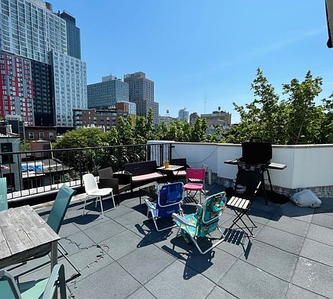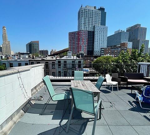 Park Slope three bedroom apartment with a shared spacious roof deck with one other tenant that has an AMAZING must see view of Manhattan and Brooklyn. Three separate bedrooms makes this a good space for shares or students. Guarantors are OK. Sunny 4th floor apt ( walk up ) with hardwood floors, high ceilings and exposed brick. Great North Slope location. Steps to 5th Ave shops, bars and restaurants. A short walk to trains and Atlantic Ave. Heat and hot water included in the rent. NO dogs please. No laundry in the building. NO FEE.