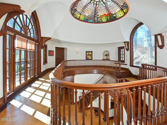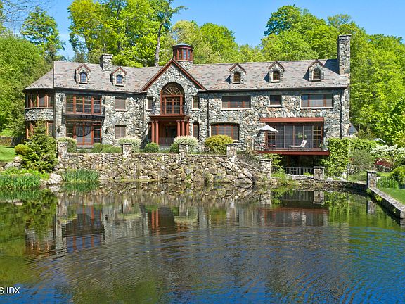 Priced to sell! Come see this magnificent stone villa on 4.7 bucolic acres only moments to charming Main St in Ridgefield, CT. Custom built for the current owner, notable details include the handsome slate roof, custom Tischler windows and doors, stunning oak flooring, mahogany doors and bookshelves. Most stunning is the foyer with its double staircases and a 26-foot high, vaulted ceiling crowned with custom-designed, hand-cut, stained glass window panels of wild flowers. The first floor offers a spacious open floor plan with an eat-in kitchen overlooking the family room with views of the pond, a dining room, library, formal living room, two 1/2 bathrooms and three wood burning fireplaces. Upstairs, the primary bedroom has a 20-foot-high dome ceiling, fireplace, and a luxurious bathroom, adjoined by a walk-in closet. Three additional bedrooms, two bathrooms, a laundry room and ample storage complete the second level. The lower level of the house includes an office area, playroom, storage, and a half bathroom. There is a detached 3 bay garage, with a 775 s.ft., income producing one bedroom rental apartment. A rare opportunity to own this exceptional estate. Please note some images are virtually staged.