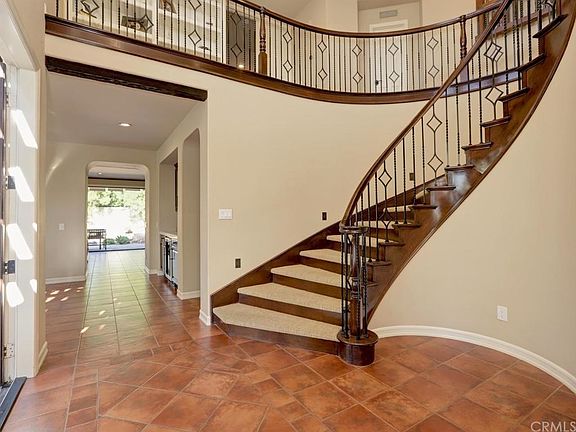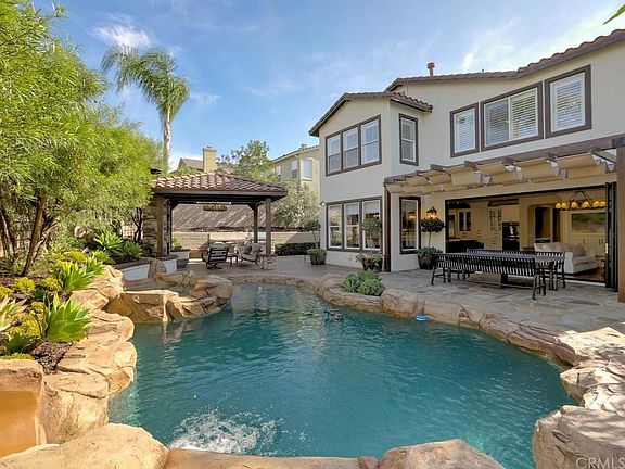 Model-perfect Rosewood home with incredible outdoor entertaining area and huge 16' wide La Cantina folding door in family room, that lets the outside in and inside out for those perfect SoCal evenings. Largest floor plan in the tract with 4 beds, 4.5 baths, and hard-to-find 4 car garage. Over $250k invested, fully remodeled kitchen features 2 large islands, quartz countertops, farmhouse sink, high end stainless appliances (Subzero, Thermador, U-line). Large and open family room, dining room, living room and en-suite bed and bath complete the lower level. Upstairs is a bonus room, 2 spare bedrooms and large, spacious master bedroom featuring an upgraded master bath. Outside it doesn't get any better with resort-like pool/spa/BBQ and covered outdoor room complete with fireplace, TV, SONO's, chandelier, and double electric heaters. Additional upgrades includes Culligan whole home water softening system, Nvidia tankless whole home water heater, indoor/outdoor whole-home Sonos app & zone based sound system, custom woodwork, custom fireplace and LED lighting. Side yard features tranquil courtyard with fountain off dining room and sport court area in rear side yard. Garage is also finely appointed with polished concrete floors, Clopay insulated garage door, built-in cabinetry/workbench and overhead storage racks. SONOS, Apple TV, all mounted TVs are included in sale--just bring your furniture!