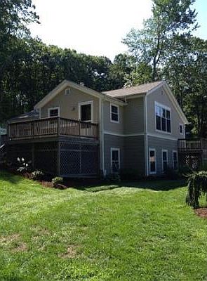 Beautiful Nantucket style home with stunning western views of Thompson Pond. This home has a lovely open floor plan including hardwoods, granite kitchen, vaulted ceilings and whole home filtration system. First floor master slider leads to expansive deck and landscaped yard with fenced-in play area. Abundant storage including walk-in closet. Finished laundry on lower level. Full recreational usage of Thompson Pond.