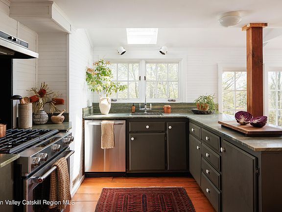The Silver Wings Compound is a unique and sprawling property set on 9+ enchanting acres at the base of Overlook Mountain. This special offering has multiple structures including a main house, guest house, artist's studio, barn and pool. A quintessential Woodstock retreat, Silver Wings sits perched on a rocky bluff among majestic land with woodland and pasture views, a pond, impressive stonework, and access to a walking trail leading to a viewpoint. This historically significant home was owned for over 50 years by the late Peter Mayer, a major figure in publishing and founder of The Overlook Press, hence the numerous built-in bookcases throughout. The main house is equipped with a cozy living/dining area, beamed ceilings, large vaulted great room, built-ins, bright eat-in kitchen, 2 fireplaces, and a bedroom suite on the main floor. There are two separate staircases leading upstairs to the second bedroom suite, cedar sauna, balcony, sitting room and another full bath. The house flows beautifully to the outdoors and adjacent buildings. The guest cottage sits next to the main house and has a sweet eat-in kitchen, stone fireplace, 2 bedrooms, 2 bathrooms and a sunny desk nook. The Artist Studio is tucked in the woods with vaulted ceilings, full bathroom, and huge doors opening to the fire pit. There are many charming areas to enjoy the outdoors including stone patios, multiple decks, and across the pristine front yard is an in-ground pool with seasonal mountain views plus a pool house. This idyllic compound is just 7 minutes from the Village of Woodstock and under 2 hours to NYC.