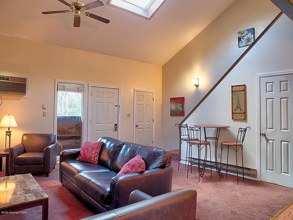Enjoy it yourself or rent to vacationers, or both. Especially pretty villa with a porch, a balcony and a small deck with view of a pristine stream and lots of native rhododendron. Greatroom with brick woodburning fireplace, kitchen-dining area with access to the porch. One first floor bedroom and bath. Master upstairs has a sitting area and bath with cedar sauna. Spectacular location with Camelback skiing, indoor and outdoor water parks. Convenient to I-80, outlet shopping center.