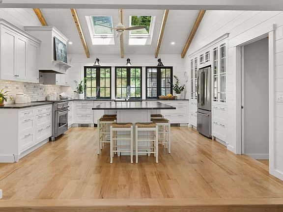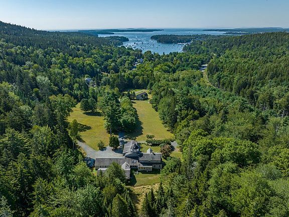 Located in a beautiful, private setting on the outskirts of Northeast Harbor, Asticou Acres is a wonderful estate property offering a large, shingled home with distant ocean views from the upper floors, two barns and a lovely grounds bordering Acadia National Park. Approached by a beautiful, tree-lined driveway, the year-round home is ideal for large gatherings with five bedrooms and a beautifully, renovated kitchen and great room overlooking the raised terrace and breathtaking yard and field. The renovated, open concept kitchen was awarded first place in large kitchen design by the Maine Chapter of the National Kitchen & Bath Association. It boasts cathedral ceilings with skylights; leathered, granite countertops; custom white cabinetry; designer appliances; a farm sink and an oversized island perfect for prepping meals and informal dining. The first floor also includes two dens, a guest bedroom with full bathroom, a large laundry room, a second full bathroom, storage areas and a tiled foyer leading to the attached 3-bay garage. The second level floor plan includes a primary bedroom suite with a private deck offering faraway ocean views, a large en-suite bathroom and walk-in closet. There are also three additional guest bedrooms, two full bathrooms and a sitting room on the second floor. A staircase leads to an intriguing observation tower with views across the meadow and woods to the harbor beyond. The property includes a large barn with three horse stalls and a second stable/garage with additional storage on the second floor. Although privately sited, Asticou Acres is just moments from Acadia National Park as well as Northeast Harbor shops, restaurants, the waterfront and private clubs. This could your ideal year-round or summer residence.