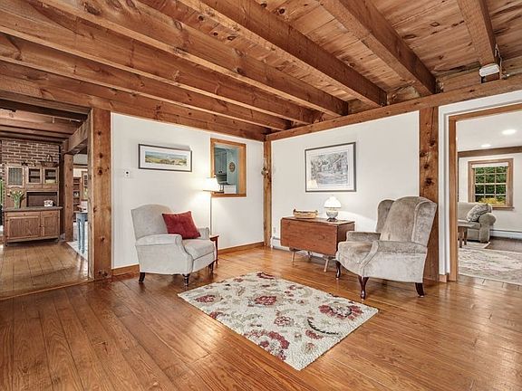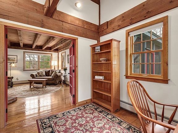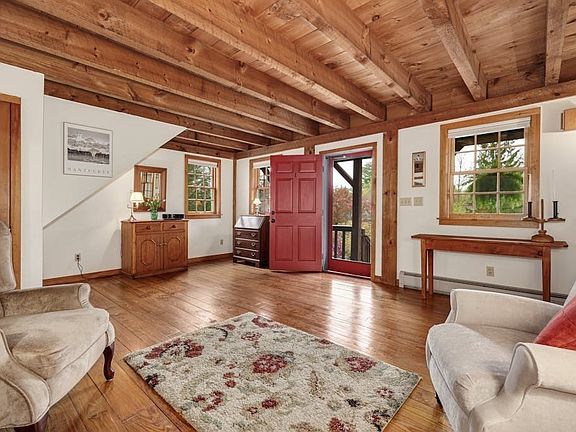 One of a kind Maine Post & Beam Saltbox with several timber frame additions is situated on level 3/4 acre lot, located in cul-de-sac neighborhood. Surrounded by established, tranquil perennial gardens, shrubbery & natural habitat w/floral colors staged from April to October. The home & landscaped property designed & created w/attention to quality, workmanship & detail. You will find a balanced combination of privacy w/nature & accessibility to schools, stores & recreation. The first floor w/flexible floor plan has living room, family room, study, home office, full bathroom, dining room & kitchen. Three season porch overlooks beautifully landscaped yard. Primary suite w/new bathroom, walk-in closet/dressing room, hardwood floors & recessed lighting. Two additional bedrooms w/hardwood floors & full bathroom. Finished lower level family room w/fireplace. Laundry, utility & storage rooms. Timber framed barn serves for 2-car garage and bonus room for gatherings. All of this is a must see!