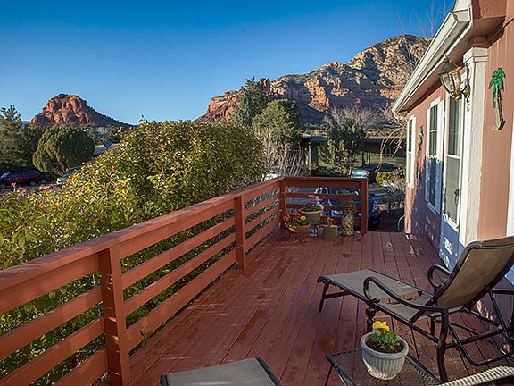 This hilltop artists home is bright and beautiful, private, and has been lovingly maintained. This 3 bedroom, 2 bath manufactured home has a split floor plan and has been been upgraded with ceramic tile floors, textured walls, custom paint, skylights and a wood burning fireplace for relaxing on quiet evenings. It also features an elevated deck, red rock views, a private and fenced-in back yard, and a custom built storage shed that matches the style of the home. Enjoy a short walk through a quiet neighborhood to some of Sedonas most beautiful trails. You will love relaxing on your deck, enjoying the privacy of your elevated view lot. Brokered And Advertised By: HomeSmart Fine Homes & Land Listing Agent: Eileen Schreiber