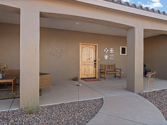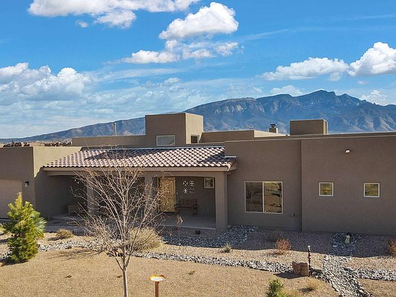 Experience unparalleled living in Placitas, NM. Set against the majestic Sandia Mountains, this home welcomes you through a handcrafted Alderwood door into an open-concept space with upgraded lighting and remote-controlled blinds. Gourmet kitchen boasts Subzero, Wolf, and Bosch appliances, seamlessly integrated into rich Alderwood cabinetry. LVP flooring graces the main areas, while the primary suite features Kohler faucets, a frosted glass hallway door, and elegant tile finishes. All bedrooms feature en-suites. Enjoy al fresco dining with mountain views on fully landscaped, irrigated grounds. Additional amenities include a water softener, reverse osmosis system, re-circulating hot water, new remote-controlled ceiling fans, a TPO roof over the garage and entrance, and a three-car garage.