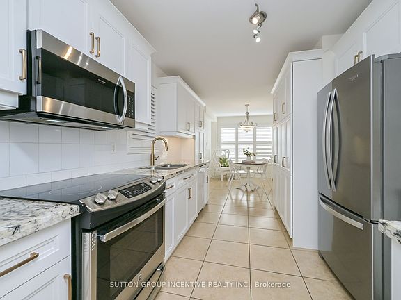 Crisp clean white kitchenGranite countersTiled back splashCeramic floorQuality stainless stovePerfect breakfast nookEngineered hardwood
