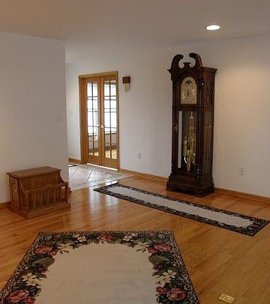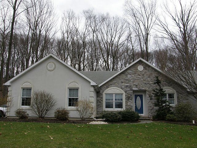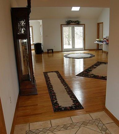 Perfectly designed custom built home surrounded by beautifully landscaped grounds. This home is all one floor living with an open concept.Walk into the foyer area which leads you into a large great room offering all hardwood oak floors, skylights, fireplace and glass doors. Kitchen opens up to the great room with custom cabinetry, eating area, lots of counter, and very, very sunny. Master bedroom is divided with oak columns allowing for an office, sitting area, nursery, exercise area, your choose. Master bedroom also has 2 closets, and wonderful bath with large soaking tub. Glass sliders in the Master lead to back deck.Home also offers 2 other bedrooms with their own sink area joined by the bathing area. Private dining room with another fireplace. Separate laundry room. Large powder room. Lower level is ready for your imagination with, high ceilings, daylight windows and glass doors. 2 car attached garage. All located on a cul-de-sac in a very beautful setting.