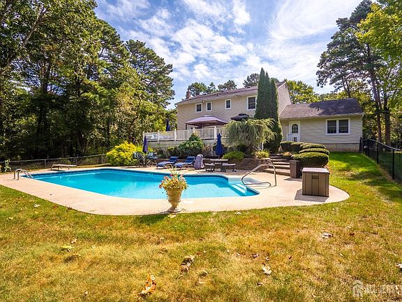 Welcome to 15 Toby Terrace, a meticulously maintained and stunning updated home in Monroe, NJ with 5 bedrooms and 2 1/2 bathrooms, located on a private cul-de-sac location. This property boasts a stunning lazy L-shaped pool (40x20) with new filter, pump, and newer liner, an expansive 25x40 deck with dual halogen lighting systems, and a fenced-in yard for privacy. The home features a recently updated high-efficiency HVAC system, and whole house fan for optimal climate control. Inside, you'll find an elegant foyer with ceramic tile flooring, and a completely remodeled kitchen that's sure to impress with its updated maple cabinets featuring pull-out drawers, granite countertops, large pantry, designer ceramic tile backsplash, two hanging lights, and newer stainless steel appliances including a 2-year-old stove. Hardwood floors grace the main living areas, while Pella Thermoplan windows and Anderson sliding glass doors enhance energy efficiency and style. The spacious primary bedroom offers a large, customized closet, and the ensuite bathroom boasts floor-to-ceiling ceramic tile, glass shower doors, cultured marble countertops, and upgraded lighting and mirrors. The hall bath features granite countertops and floor-to-ceiling tile, while the powder room sports a new quartz countertop. A finished basement provides additional living space with a game room, TV room, and exercise area. Natural stain woodwork throughout, ceiling fans in all bedrooms, built-ins in the family room, and designer Hunter Douglas blinds in the dining and living rooms complete this turnkey home. With its blend of modern amenities and classic charm, this property in desirable Monroe Township is not to be missed.