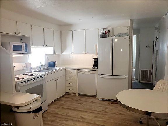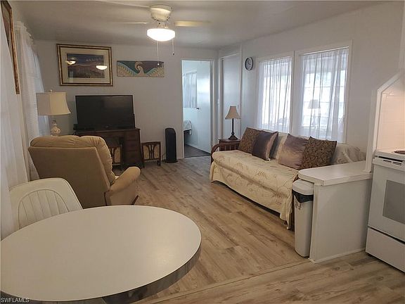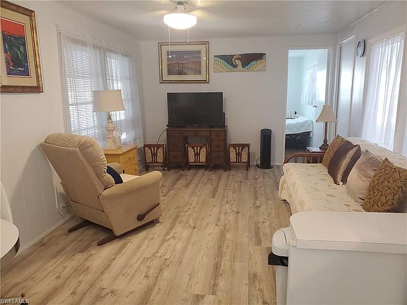 Move-in, mobile wasn't flooded, owner mention sits on higher ground. This single wide mobile home has 2 bedrooms 2 bathrooms, large Florida room, storage shed that you will find the washer and dryer inside. The windows in the bedroom are newer single hung, new stove. REROOF done in 2021, HVAC approx. 2017, White French door refrigerator with freezer on the bottom. Newer laminate floor in main living area and one bedroom. The 2nd bedroom has carpet. Split bedroom floor plan. The carport has a lattice divider on wheels toward door so you can have a private sitting area outside and still have room to park your car. Enchanting Acres is a 55 plus in age community, coop ownership, Community Pool, Club House, and Shuffle board. Located close to Bayshore Arts District, 5th Avenue South and 3rd Street South, Publix across the street from community along with restaurants, movie theater. Sugden Park is just down the street. Don't miss this opportunity to Live in the Paradise Coast of Florida.