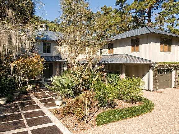 The contemporary waterfront home at 15 Trading Post Trail offers a unique combination of stunning views, a deepwater dock and a location conveniently within walking distance of the Club’s amenities. The two-story home sits high above Chechessee Creek and looks out across an ever changing salt marsh.