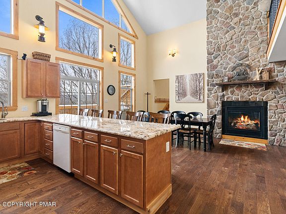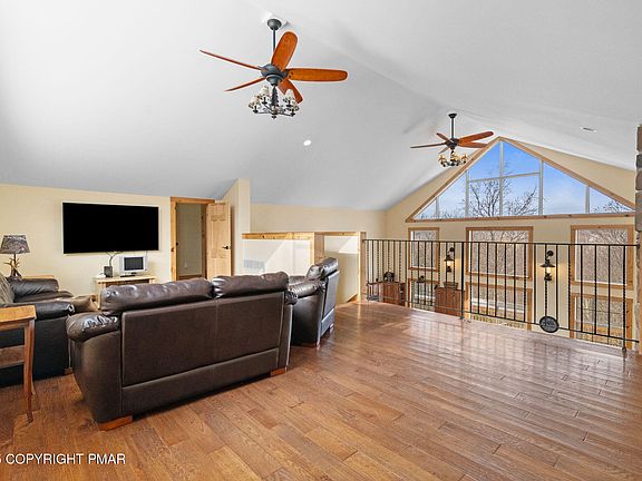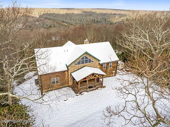 Gorgeous Pocono Log Home with forced air heat, central air, & built-in 2 car garage on 1 acre for sale in Rhodo Mountain Estates! This beauty is sure to impress with the open concept kitchen & dining room's soaring cathedral ceilings & striking wall of windows overlooking serene Pocono wilderness! The gourmet kitchen showcases a gleaming breakfast bar with ample counterspace, cabinetry, & seamless functionality! The striking 2 story stone fireplace provides all the rustic charm you are looking for while keeping you cozy on those chilly mountain nights! 2 primary suites on the main floor provide excellent owner and guest accommodations! The oversized loft is wonderful for relaxing or entertaining. The sprawling lower level family room features a billiards area & exit to the rear hot tub patio! This spacious home includes 7 bedrooms & 5 bathrooms! The lower level features an oversized bunk room for extra sleeping space. Enjoy the fresh outdoors and stunning mountain views on the 2 tiered deck! Tucked away on this private 1 acre lot rich with rhododendrons, you are sure to experience the call of the outdoors! Minutes to hiking, biking, rafting, Hickory Run State Park, downtown Jim Thorpe, & more! See today! Home has a 3 bedroom septic system.