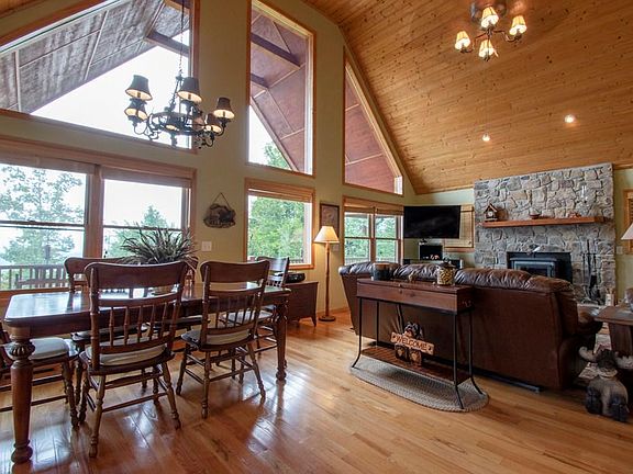 LOOOONNNNGGGGG range mountain year round views from this immaculately maintained chalet. Main level has an open great room with wood floors, cathedral tongue and groove ceilings, custom rock fireplace with wood stove insert, and lots of windows overlooking the view! Upstairs has a spacious enclosed master bedroom overlooking the mountains with en suite bathroom and walk in closet. Basement has family room with custom rock gas log fireplace, kitchenette area, office room with closet, and 3rd full bathroom. The exterior has an abundance of deck & porch space, landscaping, firepit area, and a 1 car detached garage. Furnishings negotiable! Move-in or rent out ready!!
