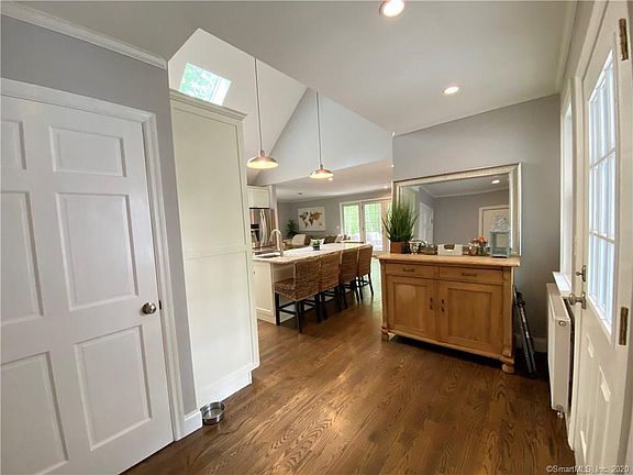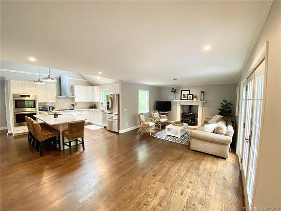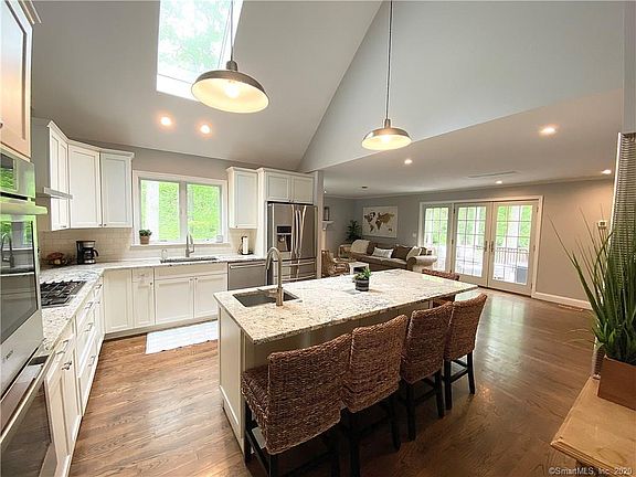TURNKEY. Completely renovated & expanded cape with a chic vibe. Re-designed kitchen great room, new baths, new windows, new roof, new HVAC, oversize 2-car garage addition with unfinished space above, new driveway, new deck, new landscaping and stone wall enclosing the property, french doors to a sunny deck. The light-filled walk-out lower level includes a playroom, gorgeous full bath and 4th bedroom or bonus room with fireplace. There is nothing to do here but bring your furniture in & start enjoying this great house!