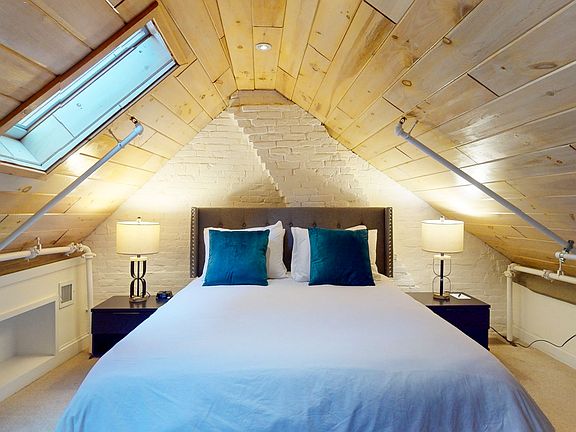 The primary bedroom, situated on the top floor, is bathed in natural light from overhead skylights, providing a tranquil retreat after a day of exploring the city.