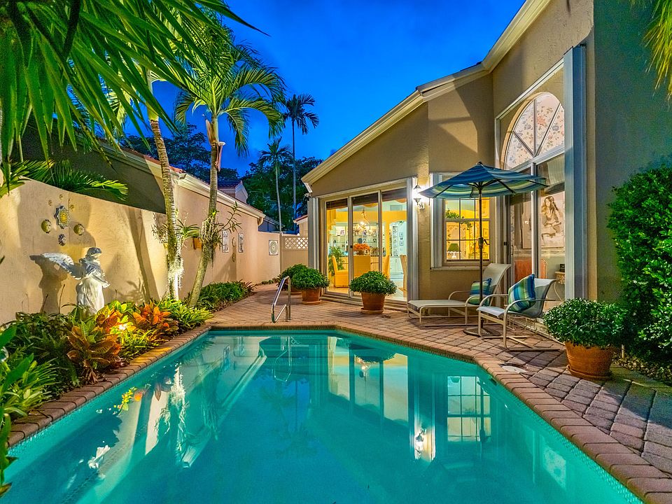 Slice of heaven! This immaculate one level home is located in the picturesque ''Italian'' neighborhood of Villa d'Este in famous PGA National. The home features a bright, professionally decorated interior, spacious living area with vaulted ceilings, open peninsula kitchen, 3 bedrooms w/ split layout and a private courtyard with pool. The area is known for tree-lined paver streets, quaint gas lights, and a beautiful community pool where neighbors gather for parties during season. One of the friendliest neighborhoods in PGA! Also includes exceptional landscaping, custom built-ins in every closet, and garage storage. This low maintenance home has solid concrete construction, natural gas appliances, low HOA fees, easy-to-use accordion storm shutters w/ 2010 roof. Club membership not required.