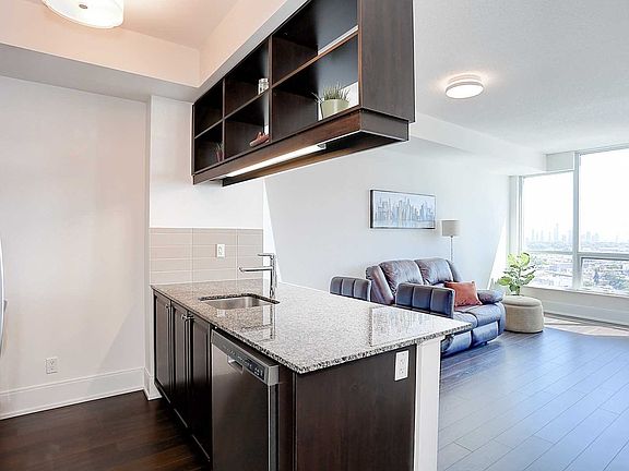 671Sf, Bright Southeast-Facing One Br+Den Tridel Suite Featuring Unobstructed View Of Lake Ontario And Downtown Skyline;Huge Windows And Open Balcony. Immaculate Unit With 9" High Ceiling, Upscale Finishes, Laminate Floors, Open Kit, Granite Counter+Breakfast Bar...Convenient Location Across The Street From Kipling Transit Hub (Subway, Ttc, Miway, And Go), Only 5 Mins To Hwy 427/Qew And 10 Mins To Airport In New Etobicoke Town Centre;1 Min Walk To Subway