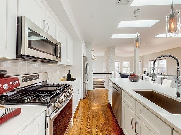 Absolute showstopper of a penthouse with not 1 but 2 private outdoor spaces, exclusive parking and an abundance of natural light via insane window count and 8 skylights. 2017 construction, this young condo boasts an expansive open living-dining-kitchen room. A sparkling white stone feature wall with fireplace is the centerpiece of the expansive space that lends to any size dining table and living room furnishings. Rounding out this space are a perfectly positioned private balcony, mudroom space, and oversized kitchen accented by quartz waterfall island, tons of cabinetry and seating for plenty. Hallway complete with washer/dryer, full bath and closet, leads to both bedrooms. Master suite complete with walk-in closet + built-ins and dual vanity master bath with marble/glass shower. New stunning private roof-deck with 360 degree views. Private storage in basement. 0.4 miles to the Red Line train. Property Website and more info : https://www.seetheproperty.com/u/413932 2022-06-21