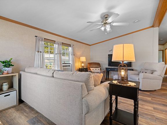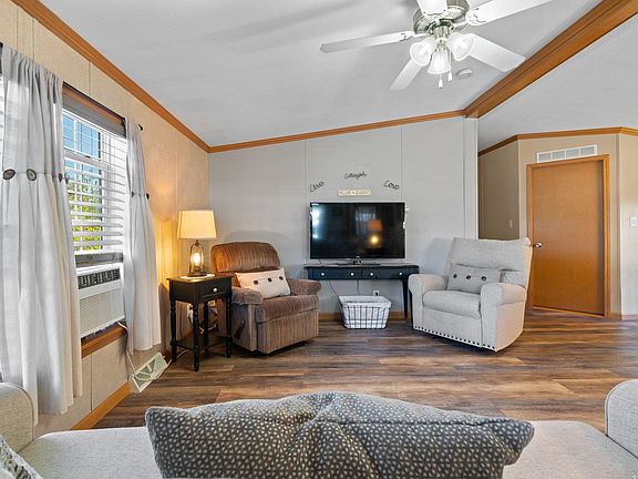 Welcome to your new home! This charming 2-bedroom mobile home with an additional room that can be used as additional living space, an office or a playroom. As you step inside, you’re greeted by an inviting open layout, seamlessly integrating the kitchen, dining area, and living room—perfect for entertaining or relaxing with family. The kitchen is well-equipped, featuring ample cabinet space making meal prep a breeze. Adjacent to the kitchen is the dining area, which flows effortlessly into the cozy living room, creating a warm and welcoming space for gatherings. The skylights brighten the home, letting in natural light. One level living ensures easy access throughout. The spacious laundry room makes household chores straightforward and efficient. There are two well sized bathrooms, the step in shower off the primary make is easy for accessibility. This freshly painted and meticulously maintained, home exudes a bright and clean ambiance. Step outside to the small front porch, a charming spot to enjoy your morning coffee or unwind in the evenings. There is a large yard for the games, activities and family gatherings. This move-in-ready mobile home is a wonderful place to call your own. Open houses will start Saturday, September 14th 10am-11:30am and Sunday 15th 11:30-1:00pm.