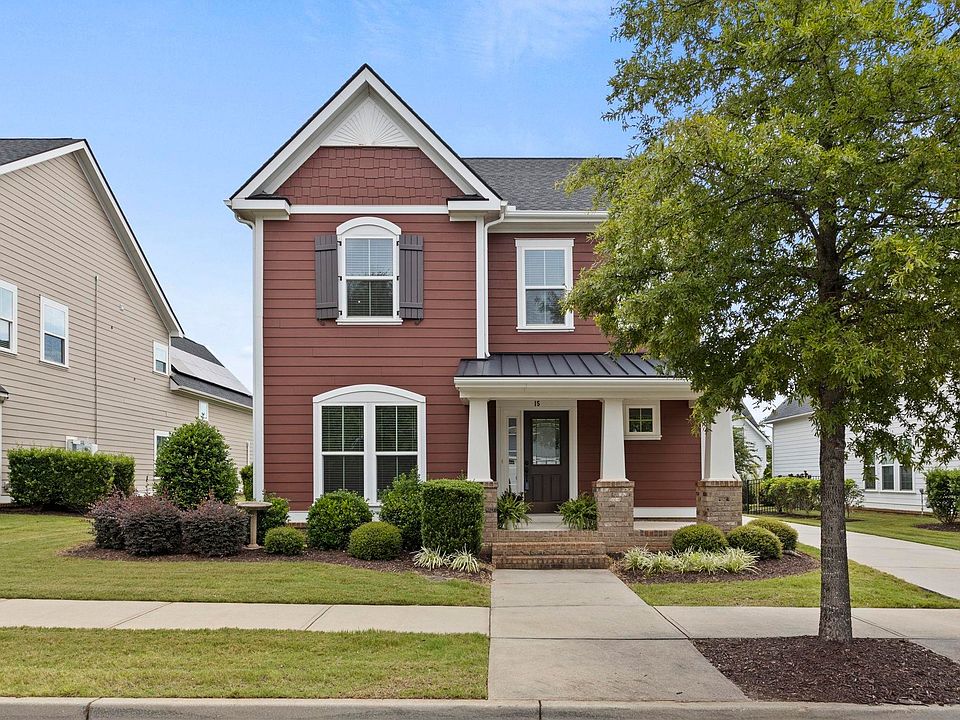 Belhaven @ Hollingsworth is just steps away from beautiful Legacy Park located in the heart of the neighborhood, complete with walking trails, playground, and open green space for picnics and more. This home is situated on one of the larger level lots and boasts a wide craftsman style porch with brick columns. Current owner made the following upgrades: added hardwood floors upstairs, fresh paint, brand new subway tile backsplash in kitchen, brand new dishwasher and microwave (all appliances convey but sold in "as is" condition), new marble surround on FP in great room featuring gas logs, brand new full bath including tile, tub, and vanity sink. Primary bathroom sink faucets to be replaced to match shower. Open floor plan, granite countertops, detailed ironwork on both staircases, finished room over garage has separate stairs for privacy. Primary BR offers trey ceiling, large closet, oversized shower, and separate linen closet. Join this super neighborhood complete with community garden, coffee shops and restaurants! Owner/Agent