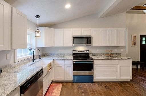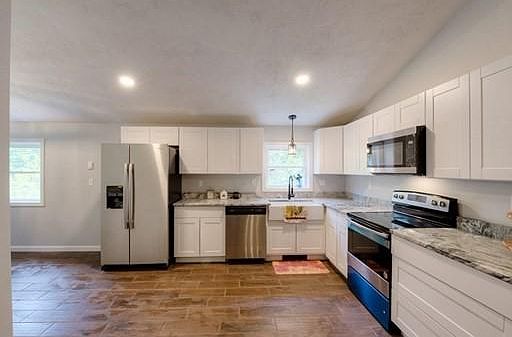 For a showing call Billie Jean at 413-355-4070 or go to www.KKING.com! It doesn't get any closer to new construction than this one! Total rebuild inside and out. Walking into the living room from the large front deck, this farmhouse chic style home with soaring ceilings and wooden beams is sure to spark your interest. An impressive spiral staircase leads you up to the loft that can be used as you desire. Office space, play room, family room? The decision is yours! The spacious kitchen has swirled granite tops, tile flooring and a large farmhouse style sink. Offering vaulted ceilings and tons of cabinet and counter space, even room for a small island. The dining area is right off the kitchen with tons of light pouring in, leading to the back door with a view of the serene woods. The bathroom has a double vanity and vessel style sinks, tile floor, and laundry hookups. 2 bedrooms with ceiling fans and large windows complete the home. If that isn't enough, then how about the deeded beach rights at Lakeland Beach Association which is right at the end of St!