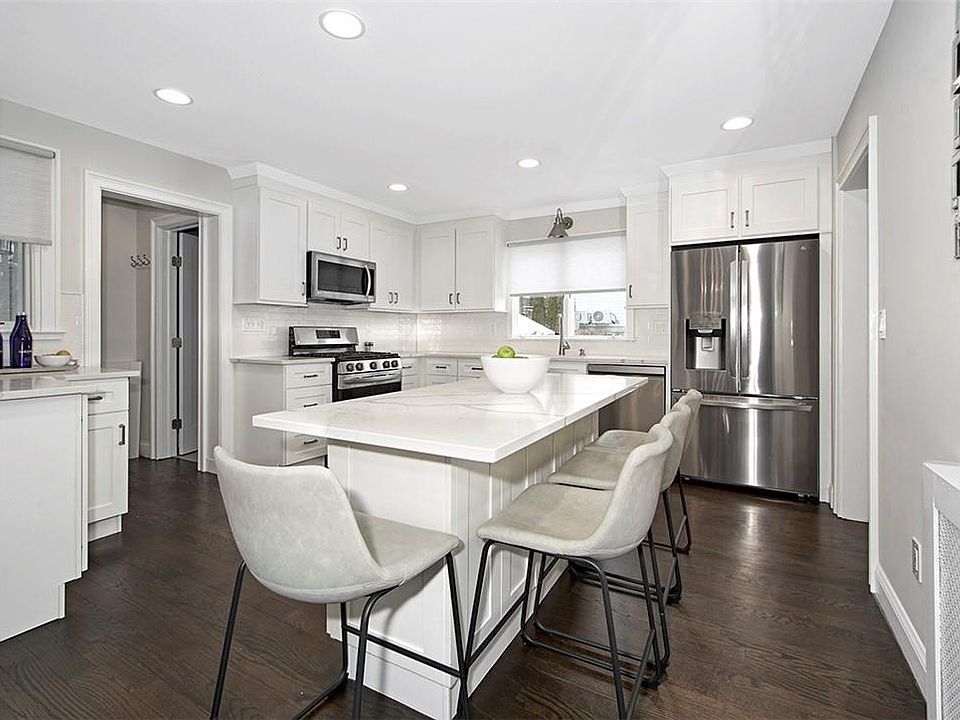 - Description: Bright & open kitchen with stainless appliances, quartzite counters & island seating