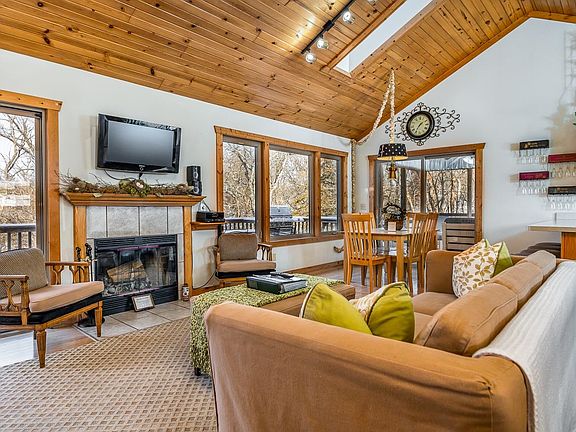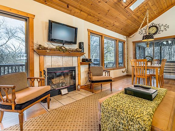 Licensed for short term rental! Light and bright 3 bed, 3 bath Galena Territory retreat with rustic flair sited on .88-acre homesite with beautifully treed backdrop and outdoor entertainment areas galore. Inviting covered porch greets you upon approach and leads to main level featuring airy great room style living room with wood floors, skylights above adding to the natural light, cozy wood-burning fireplace, access to rear deck, and gorgeous wood clad cathedral ceilings, open dining area that feeds to large, screened porch, nicely appointed kitchen with ample cabinetry and counter space, stainless appliances, and eat-at counter, spacious master bedroom with more cathedral wood clad ceilings and adjacent full bath with tub/shower combo. Descend to the finished walkout lower level to find a comfortable family room with hanging curtain to partition for additional guest sleeping area and access to rear concrete patio, fire pit area, and hot tub gazebo, two generous guest bedrooms each with direct access to one of two well-adorned full bathrooms, and convenient laundry area. Enjoy the incredible surroundings and abundant nature from a multitude of outdoor areas that include a huge covered front porch that flows into expansive deck wrapping around the side and rear of the home all the way to adjoining screened porch, sweeping lower concrete patio that leads to gazebo with hot tub for the ultimate in relaxation, and warm and inviting fire pit space with natural limestone accents. Asphalt driveway with plenty of parking. Close proximity to North Cove, Lake Galena Marina with outdoor rec space and boat ramp, Owners' Club with indoor/outdoor pools, fitness facility, game room, and multi-sport gymnasium, and all the golf, spa and dining amenities of Eagle Ridge Resort & Spa. Sold nicely furnished with some minor exclusions and to be transferred via separate bill of sale.