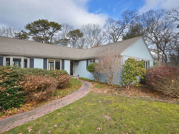 Welcome to Waterside on Coonamessett Pond! Sited at the end of a cul-de-sac sits this wonderful ranch style home on over one acre. One floor living with terrific views of Coonamessett pond. When you enter through the foyer, and you are greeted by the open style living area, you can tell a lot of thought and planning went into capturing the essence of pond front living. The views from the main rooms are beautiful. Notable features are the cozy living room with gas fireplace. An open kitchen with Jenn-Air gas stove and plenty of counter space. The spacious dining room area a family room with floor to ceiling built-ins, and a slider out to the deck where you can take in the natural beauty of your surroundings. The three bedrooms are all en suite, and the primary bedroom has lovely views. There's a cute office space and a laundry area on the main floor too. The lower level bonus room and storage. Coonamessett Pond is know for great swimming, boating and nature.