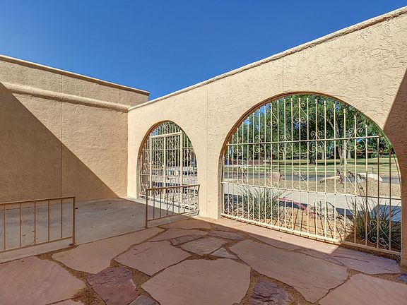 This 2,156 sqft home sits with open views of the golf course. Pull into the circular driveway and enter this home through a gated courtyard. The entry welcomes you into a large open floor plan with multiple dining areas and features a gas fireplace in the living room. The large kitchen is set up with a peninsula layout, perfect for entertaining. Off the kitchen are two sunrooms that would be ideal for an office den or sitting area. The large primary bedroom faces the golf course and has a walk-in closet, small second closet and a full en-suite bathroom. This home also features a large guest bedroom, three-quarter guest bathroom, powder room, a large laundry room with pantry and sinks and a large storage closet. The exterior is newly landscaped with a fully fenced backyard. The backyard features a flagstone patio which looks out onto the golf course. There is an attached two car garage.