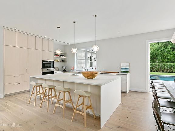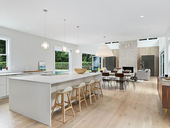 15 Wireless Road, East Hampton ; $5,995,000 Expertly executed, this compound offers buyers the unique opportunity to own both a main house and guest cottage on the same property totaling 7,300sqft of living space. At 5,500 sqft, the main house consists of 6 bedrooms, 6.5 bathrooms. The custom Henry Built kitchen with Calacatta Lincoln Marble counter tops flows seamlessly into a light filled double-height living room with gas fireplace. Two walls of Nano doors allow the homeowner to open the entire living area onto opposing covered porches with motorized Phantom Screens, creating a seamless transition between indoor and outdoor spaces. The thoughtful design provides first and second floor master suites, a junior master and 3 additional beds and baths with Stellar White Marble floors, handmade ceramic tiles and Kalista One fixtures. The lower level houses an additional bed and bath, a temperature controlled stocked wine cellar, media room and massive recreation space. With ultra-luxury finishes throughout, the house provides unparalleled style, elegance and comfort. The Gunite saltwater pool and spa are complimented by extensive mature landscaping, bluestone patios and an open air shaded breezeway cabana. In addition, there is a 3 bedroom, 3.5 bath guest cottage, with a custom Bakes & Kropp kitchen, private pool, and dedicated parking; adding an additional 1800 sqft. Both houses are equipped with Crestron Pyng home automation systems and Sonos. Come and see this exciting new project by MAP Development with architecture by Fred Smith Architect and interiors by Damon Liss Designs.