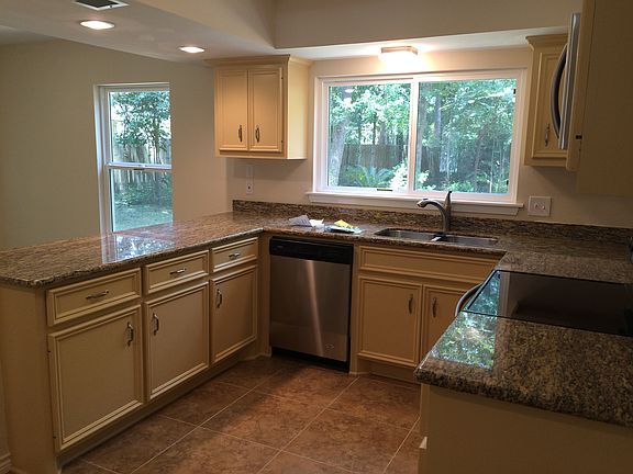 This is a 4BR and 2.5 bath remodeled home on quiet cul de sac. The home has new cabinets, granite counters, new stainless appliances, bamboo hardwood, tile, new carpet, freshly painted, new fixtures, etc. Master downstairs with 2 large walk in closets, custom 5' x 5' shower. Eat in kitchen + formal dining, open plan, fireplace, new energy efficient windows, private backyard. The home will come new stainless steel range, microwave, & refrigerator. Also, it will come with a new washer and dryer. Minutes away from the new Exxon campus, The Woodlands mall, and I-45. Access to walking and biking paths.