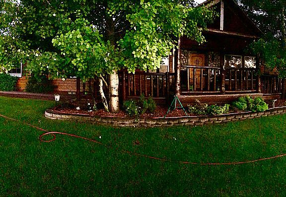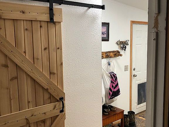 Western modern design with beautiful views of the Tongue river valley, large covered north facing deck with log accents, covered decking area on the south side of the house. large master bath remodel, tile shower, life proof vinyl flooring. large tile kitchen, pellet stove in dining area, 2 car garage, one-level living on a fantastic low maintenance landscaped corner lot. in Dayton Wyoming