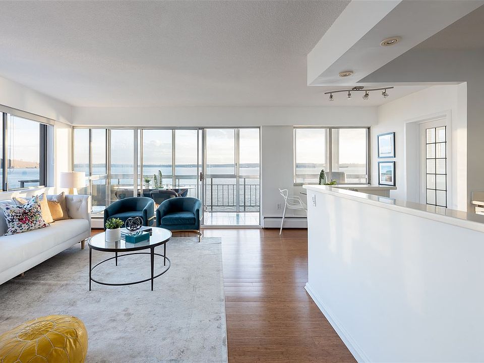 Truly incredible waterfront living in the heart of Dundarave. This beautiful corner unit boasts stunning panoramic ocean views spanning from The Lions Gate Bridge to Lighthouse Park. You feel at one with nature with the fresh ocean air filling the apartment and all-day sunlight streaming in, all the while being so close to the marine life you can almost touch it. The combined studio + 1 bdrm affords massive master bdrm with ensuite, and 2nd bdrm + full bathroom at the other end for privacy. Open concept living/dining/kitchen connect to the 40ft wide enclosed balcony which allows for a formal dining, formal sitting and office all year round. Enjoy the incredible outdoor pool in the summer & seawall year-round. Walking distance to Dundarave Village, coffee shops and The Beach House.