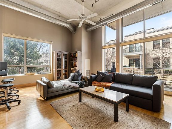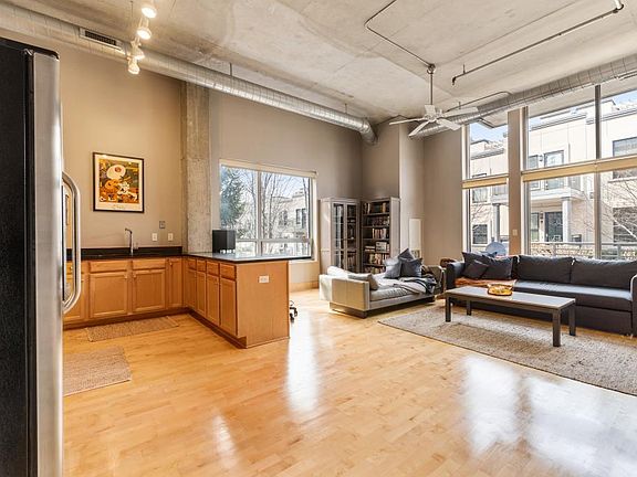 Fabulous corner unit with 12' soaring ceilings and windows in this bright, open condo with a true loft feel. Stainless and granite kitchen. Enjoy the awesome amenities including a rooftop deck overlooking the river and city, a community room and fitness center. All common areas at Village Lofts stunningly updated. So beautiful! Live along the riverfront, walk the trails and enjoy shopping, coffee shops, movie theater and restaurants!