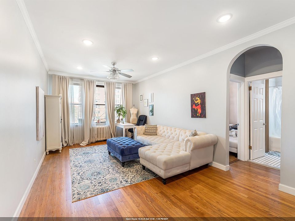 Welcome to Residence D4 — a bright and spacious one-bedroom home where thoughtful upgrades meet the timeless charm of 1930s architecture. This flexible, convertible two-bedroom apartment greets you with a gracious entry foyer, complete with multiple oversized closets offering exceptional storage. Beyond, elegant architectural archways lead you into a large living and dining area, ideal for both everyday comfort and entertaining. Soaring ceilings enhance the sense of space, while the home’s coveted corner positioning allows natural light to pour in throughout the day. A window is found in every room illuminating each area with warmth and character.