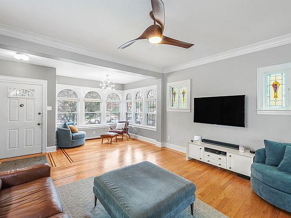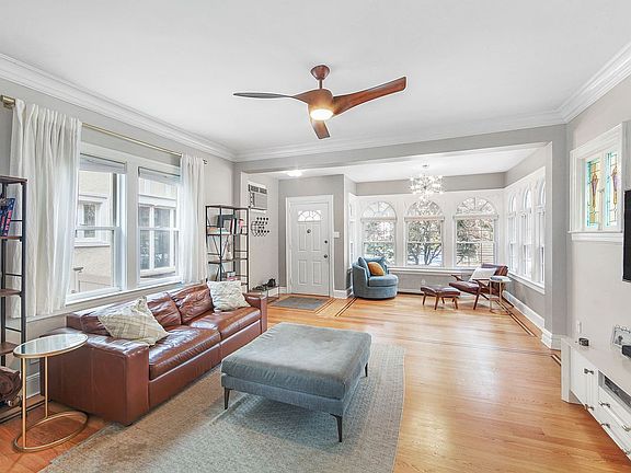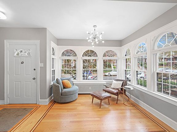 Wall to wall windows align the generously sized foyer. Upon entrance you are greeted with a preview of the expansive first floor, which is perfectly designed for entertaining and relaxation. The home is endowed with tremendous architectural merit such as the stained glass windows. Traditional hardwood flooring runs throughout the living room, dining room, and kitchen. Completely renovated and impeccably maintained, the kitchen is equipped with Professional grade Stainless steel Frigidaire Gallery appliances including a double door refrigerator, Quartzite countertops, and under mounted sink with disposal. Adjacent to the kitchen is a custom designed breakfast nook which leads to the private backyard.