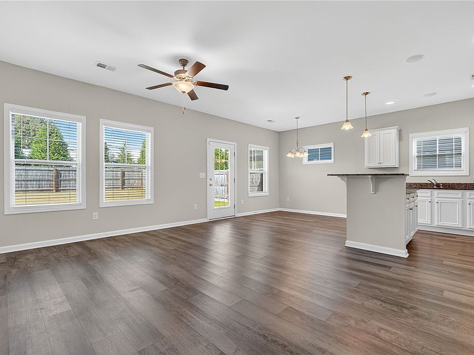 Dining spaceLarge well-equipped kitchenGenerous island with seatingOpen floor planGranite countertopsWalk-in closet