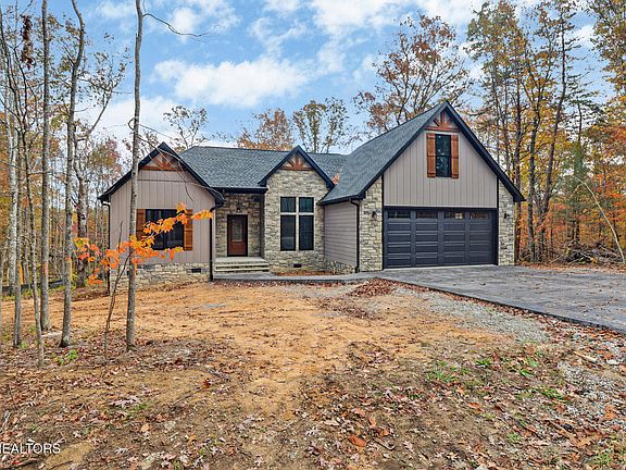 New construction, beautifully crafted 4-bedroom, 2-bath residence nestled in the serene landscape of Fairfield Glade. This thoughtfully designed home blends rustic charm with modern sophistication, offering comfort, functionality, and timeless style. Exterior & Curb Appeal: From the moment you arrive, you'll be captivated by the home's stone and board-and-batten façade, accented by rich wood shutters and gable details. A stamped concrete driveway and sidewalk add an elegant touch and low-maintenance durability. Interior Highlights: Step inside to a bright, open living area featuring beautiful hickory wood flooring and vaulted wood ceilings with exposed beams. The stone fireplace serves as a stunning centerpiece, creating the perfect setting for cozy evenings. Large Weather Shield windows flood the home with natural light and offer energy efficiency throughout. Kitchen: The gourmet kitchen showcases granite countertops, custom cabinetry, and high-end LG and Bosch stainless steel appliances. A spacious walk-in pantry adds convenience and extra storage. Primary Suite: Relax in the primary suite featuring tray ceilings, large windows, and ample space for a sitting area. The ensuite bath includes a soaking tub, walk-in tiled shower, and dual vanities, creating a private spa-like retreat. Bedrooms 2 & 3: Split bedroom design with two guest bedrooms on the opposite side of the home with large closets and a guest bathroom between them. Bonus Space: Upstairs, a versatile bonus room or fourth bedroom includes its own mini-split HVAC system, ensuring year-round comfort and efficiency—perfect for a home office, guest suite, or media room. Additional Features: Laundry/mudroom with built-in shelving, utility sink, and workspace, and covered back deck with ceiling fans, ideal for enjoying the peaceful wooded surroundings. This home combines elegant finishes, modern systems, and quality construction in a beautiful natural setting.