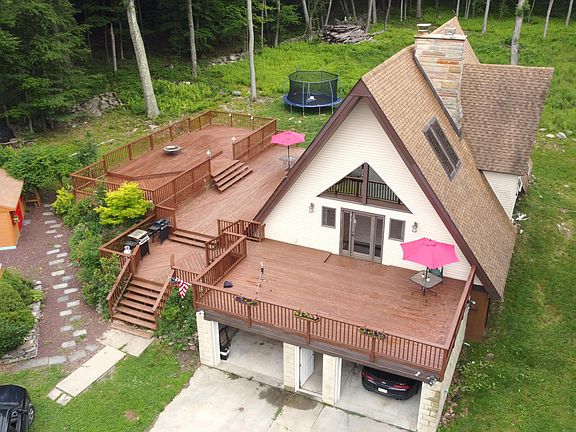 NO HOA NO COMMUNITY! Unique A-Frame with over 2.5 acres featuring a private pond! This 3-5 bedroom home has everything you could ever need in a PA mountain home - Great room with fireplace, two main floor bedrooms with a lofted master ensuite upstairs, plus a huge downstairs rec room with two additional flex sleeping areas for guests. Extremely practical home with flex heating options and laundry on every floor. Need storage? We got you covered with 4 car garage bays plus an insulated loft above the detached garage. All of this tucked into a quiet and private location not far from Lake Wallenpaupack.