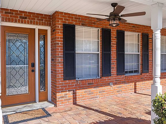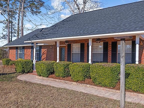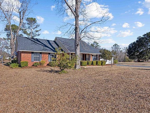 Well-maintained ALL BRICK ranch home on 8.86 acres in beautiful Lakeland, GA—just a short drive to Moody AFB. A stone walkway leads to a large covered front porch with ceiling fans. Inside, a tiled foyer opens to a spacious family room with vaulted ceiling and luxury vinyl plank (LVP) flooring. A separate dining room with barn doors offers flexible use. The open kitchen features granite countertops, wood cabinetry, ample pantry space, and a bay-window breakfast nook. An additional living area includes a gas fireplace. The split-bedroom layout offers two spacious bedrooms and a full bath with walk-in tiled shower. The large primary suite overlooks the property and includes a full bath with tub/shower combo. Tile flooring in foyer, halls, kitchen, laundry, and baths; LVP in remaining areas. Half bath located off the oversized laundry room. A true highlight of the property is the stocked fishing pond, surrounded by natural beauty and peaceful South Georgia countryside. Outdoor living continues with a swimming pool surrounded by pavers, brand-new hot tub, and a large covered, screened-in back patio. Additional features include a chicken coop, two storage buildings, NEW ROOF & HVAC, whole-house Generac generator, tankless water heater, and two-car garage. Enjoy privacy, acreage, and classic country living—move-in ready and well cared for.